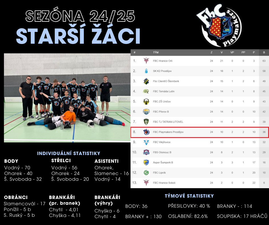 Sezóna je u konce. A jako jedni z posledních ji zakončili starší žáci. Ti do ročníku nevstoupili ideálně, když na svém prvním turnaji prohráli oba zápasy. V dalším průběhu sezóny ale zabrali a často se vraceli ze zápasů vítězní. Konečná bilance? 8. místo, výrazně kladné skóre, 10 výher. Ale také mnoho nových zkušeností, posun hráčů (nejen) po herní...